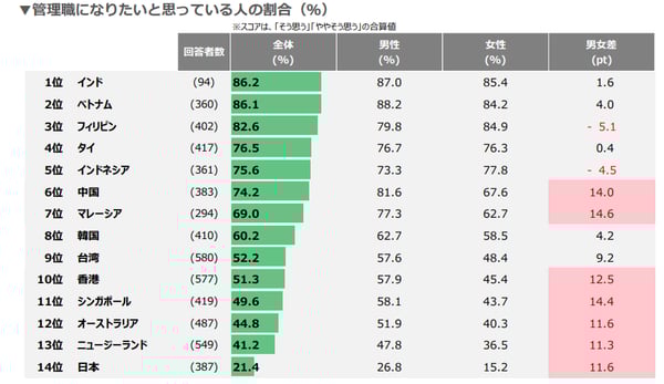 パーソル研究所の「就業実態・成長意識調査(2019年)」によると、日本の企業において管理職になりたいと思っている人の割合は21.4%であり、アジア太平洋地域の国部にの中でもかなり低い割合となっています。