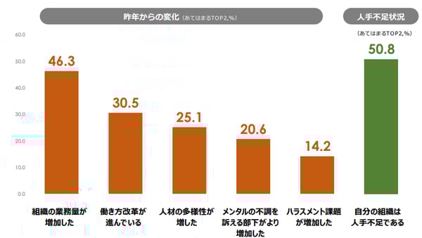 パーソル総合研究所の調査によると、業務量が増えているのに対して、人手不足を感じている管理職が多いことがわかります。根幹となる業務管理や部下の育成などの他に、コンプライアンスの厳格化や、AIなど新たな知識やスキルの習得や活用、多様な働き方への対応など、管理、推進するべき要因が劇的に増えていることが、その要因と考えられます。