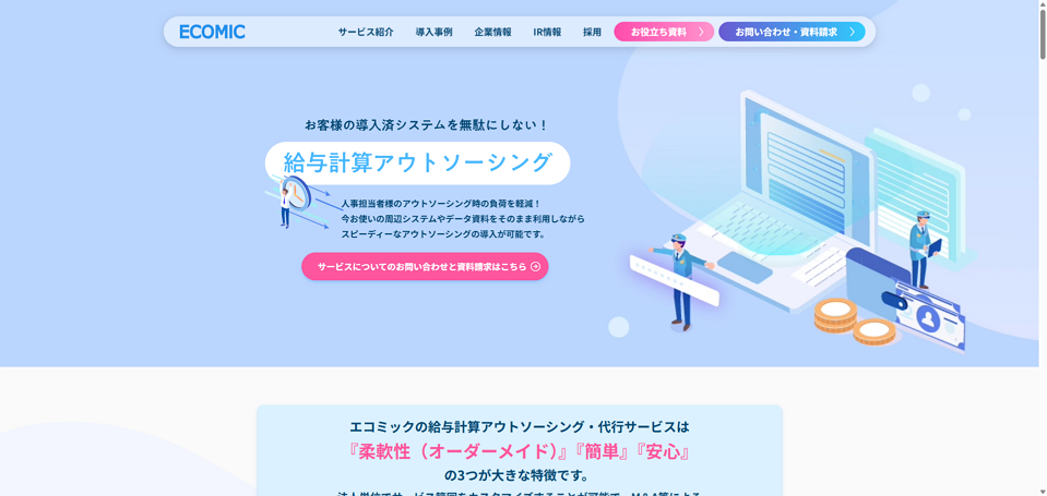 エコミックの給与計算アウトソーシングは、入力業務も含め、現状の給与計算業務をフルで委託できるサービスです。