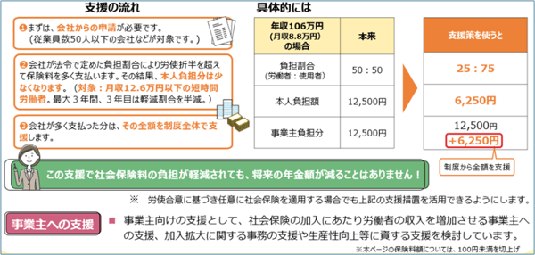 本来は労使折半(事業主と被保険者が半分ずつ負担)のところ、事業主の負担割合を増やすことによって、被保険者の負担を軽減する。 その際、事業主が追加負担した分については、その全額を制度全体(国など)で支援する ※措置を利用する場合は事業主からの申請が必要 |