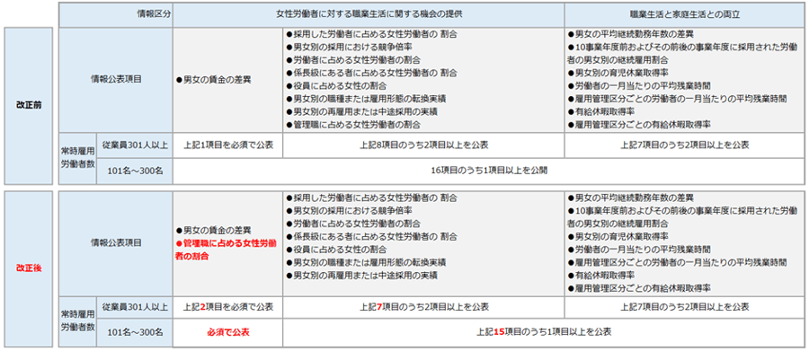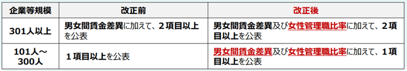 主な改正ポイントは従業員数101人以上の企業は、「男女間賃金差異」及び「女性管理職比率」の情報公表が義務となる点です。
